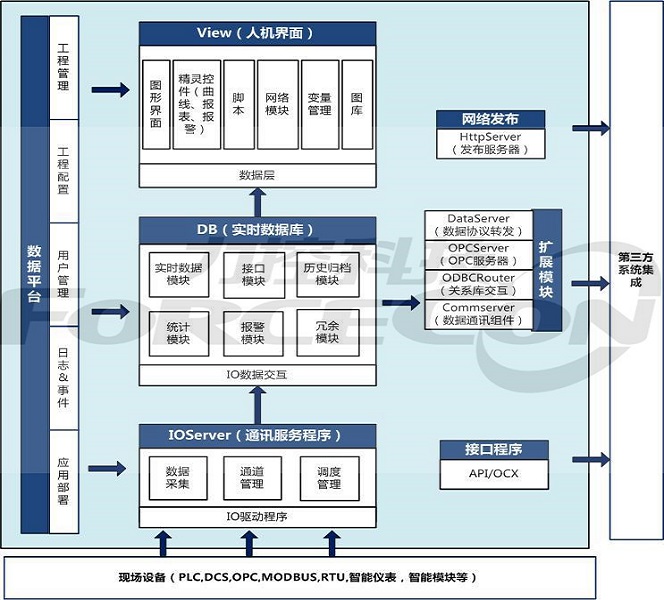 ForceControl監(jiān)控組態(tài)軟件功能架構(gòu)的核心是分布式區(qū)域?qū)崟r(shí)數(shù)據(jù)庫(kù),其它應(yīng)用程序或者功能模塊通過(guò)與區(qū)域?qū)崟r(shí)數(shù)據(jù)庫(kù)交互而實(shí)現(xiàn)其功能及擴(kuò)展。軟件的主要功能模塊包括實(shí)時(shí)數(shù)據(jù)庫(kù)、設(shè)備通訊服務(wù)程序、HMI畫面、網(wǎng)絡(luò)通訊程序、接口SDK、Web應(yīng)用服務(wù)、關(guān)系數(shù)據(jù)轉(zhuǎn)儲(chǔ)、數(shù)據(jù)轉(zhuǎn)發(fā)、擴(kuò)展組件等幾個(gè)部分。