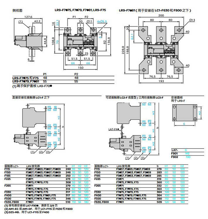 LR9-F 電子保護繼電器直接安裝在 LC1-F 型的接觸器之下。從 30 至 630 A 范圍內的繼電器有 8 個額定值。設定表盤可以通過透明保護蓋來鎖定。復位按鈕安裝在繼電器前側。
