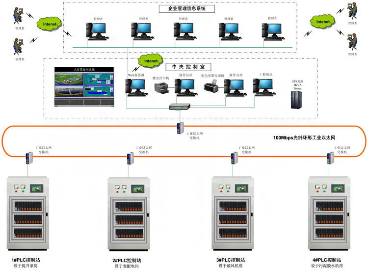 自動化系統有1個中央1個中央控制室、4個現場PLC控制站組成?,F場PLC控制站,由可編程序控制器(PLC)系統及檢測儀表組成,對污水處理廠各工藝過程進行分散控制;再由中央控制室(CCR),對全廠實行集中管理。中央控制室、PLC控制站之間的數據通訊采用高速的、實時的工業以太網,網絡結構為環形,通訊速率為100Mbps,傳輸介質為光纖。中央控制站設于綜合樓中控室;現場控制站設4個,分別位于進水泵房(1#PLC控制站)、變配電間(2#PLC控制站)、鼓風機房(3#PLC控制站)、污泥濃縮脫水機房(4#PLC控制站)。
